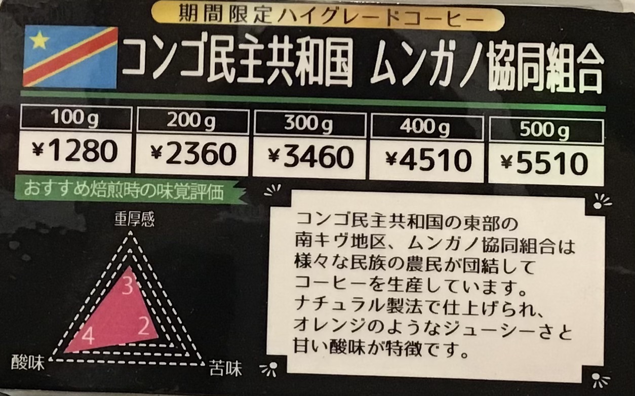 数量限定コーヒー豆『コンゴ民主共和国ムンガノ協同組合』が入荷致しました。