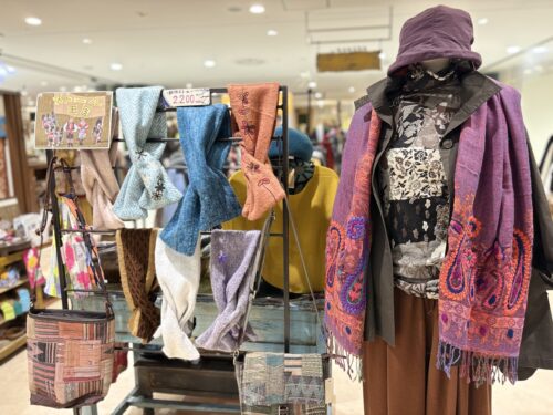 倉敷産のオリジナル綿ジャガードのカットソー、インドのベビーウールストール、ネパールフェルトバッグは秋冬アイテムのベスト3です。