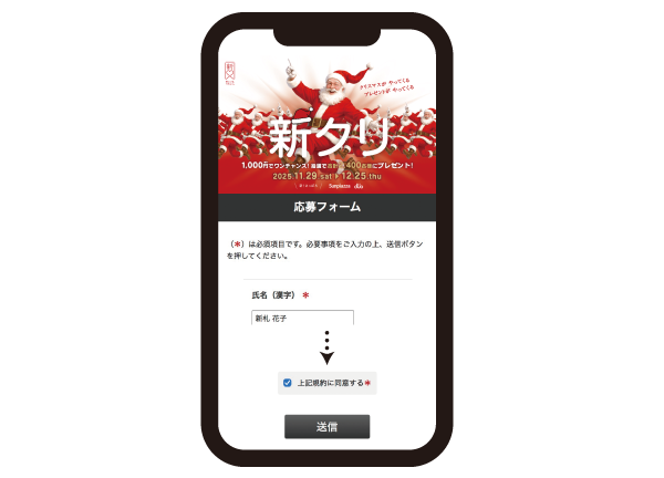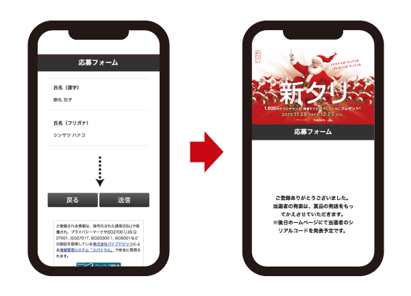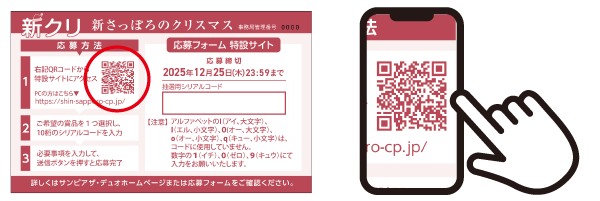 - スマートフォンで応募券のQRコードを読み込むと、応募フォームへアクセスします。